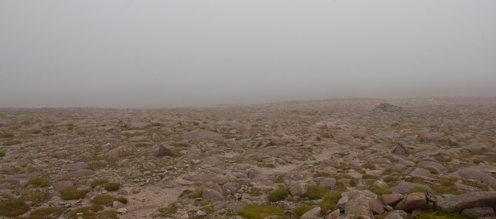 We were up early the next morning and headed off past the Shelter stone and more lochs and then straight into mist. This stuck with us for the rest of the day. It made for some atmospheric walking, but was lacking in views. Luckily the paths were easier to follow today, I think we would have been alright, even if the paths had been non-existent, it just would have made for some slower walking. We managed to climb Ben Macdui, which at 1309m is the second highest mountain in the UK and the highest in the Cairngorms. It was almost completely flat on the top, you could imagine this would be what the surface of the moon would be like. Nothing was growing, not even lichen, and it was completely covered in fog so you couldn't see more than 20m in front of you. Pretty spooky. We were the only people up there, which is always nice to have a summit to yourself.